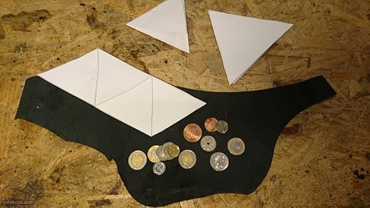 Warto zacząć od szablonu. Choć wydaje się banalny (bo to cztery trójkąty równoramienne), to lepiej zmarnować na próby kilka kartek niż kilka kawałków skóry. Wymiar każdy musi sobie dopasować sam, co jest o tyle łatwe, że do złożonego szablonu można wsypać monety.