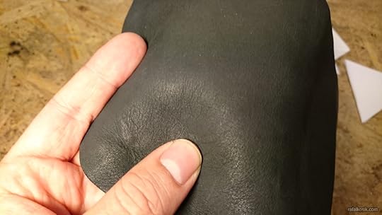 Bilonówka nie musi być wykonana ze skóry, bo i zwykła plandeka się nada, jednak… no wiecie, skóra jest skóra. Są różne sposoby garbowania skóry (co również mi podpowiedział ów kaletnik) i tak na przykład skóra wycięta ze starej kurtki będzie sprężynowała, bo jej zadaniem jest się nie odkształcać. Nawet to da się załatwić żelazkiem, ale po co, skoro można wziąć odpowiednią skórę. Na zdjęciu skóra z kangura o grubości nieco ponad 1 mm. Grubsza chyba średnio się nada.