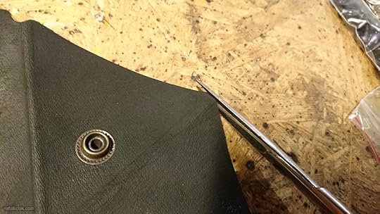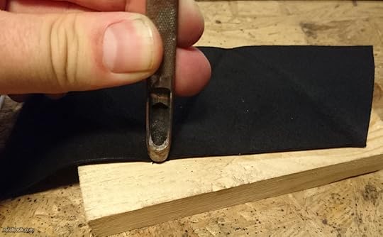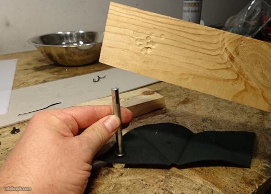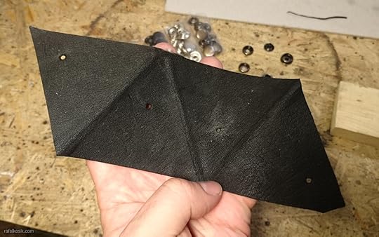 Gdy skóra przeschnie (w postaci rozłożonej swobodnie), możemy wyciąć otwory pod napy. Rzecz gustu, czy mają być bliżej, czy dalej krawędzi. Liczę na to, że będziecie przebijać każdą warstwę osobno, gdyż w przeciwnym razie trzeba będzie wszystko zaczynać od początku.