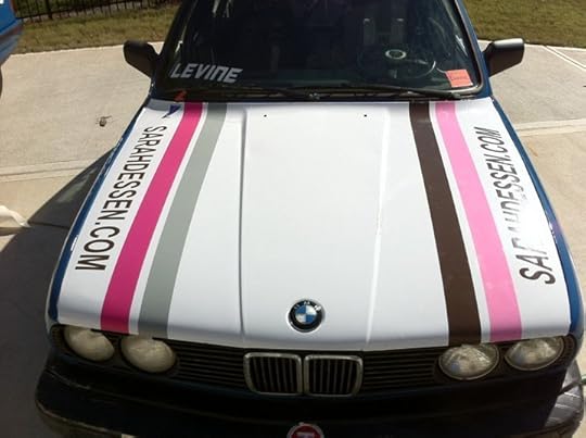 Anyway. It's the end of the weekend, I have Jane Lynch from Glee hosting SNL on my DVR waiting for me, and steak quesadillas on the dinner menu. Before I go, though, an update on something I wrote about here earlier. Remember how I told you guys about my friend Evan's racecar? He drives Spec E30 class (and no, I'm not sure what that means either, other than he goes FAAAAAAST) and was looking for sponsors. I thought it might be a fun way to promote my books to an audience that might not otherwise find them. Oh, who I am I kidding: would probably NEVER even hear of them. Anyway, in time we hope to have a fan page on Facebook, where I can link to his races, but this weekend, they started stickering the car. It's not done yet, but here's a sneak peek: