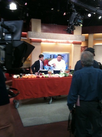 Before I knew it, it was almost 9am and time for the last segment, a cooking one. We ran back downstairs (seriously running: these people MOVE) to watch George Stephanopoulous make a pie and some chicken dish with Emeril. I did not get to meet G-Step, and so therefore do not know if he is minty fresh or not. This is as close as I got: