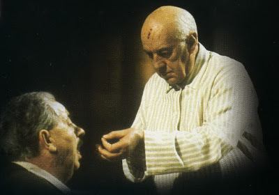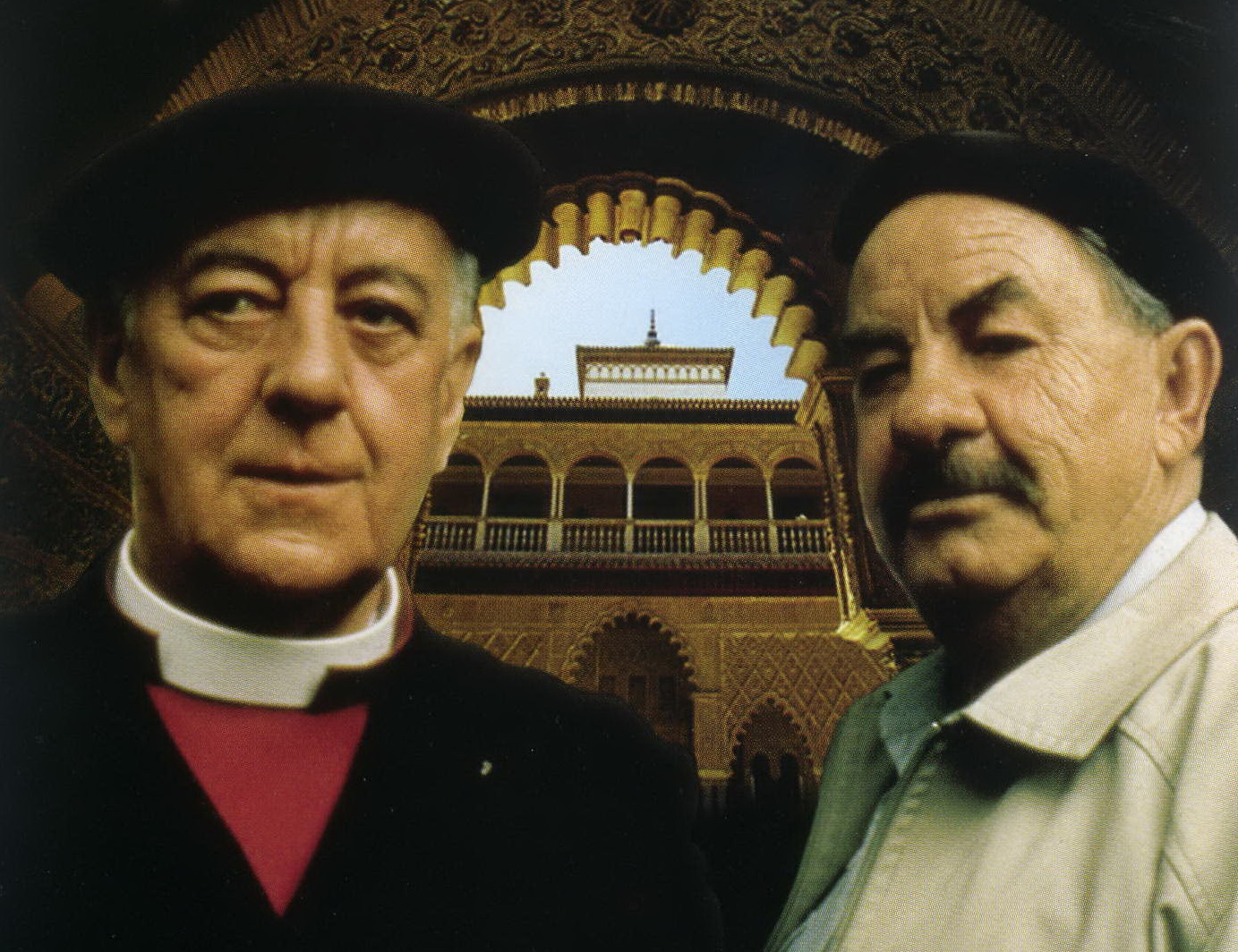Alec Guinnes e Leo McKern, nunha foto promocional da tvmovieSegu��n arodaxe co delirio dun neno lamb��n apurando o primeiro doce do d��a. Desde a mi��atoler��a cin��fila, era consciente de que tal cousa xa non volver��a a repetirse.Pode que co tempo O Carballi��o acollese outras rodaxes, pero intu��a que nuncaco pedigr�� dun Alec Guinnes. As�� que,ben s�� ou ben acompa��ado por amigos, roldabamos os lugares de traballo ou osarredores do cuartel xeral da produtora no Hotel Arenteiro, e unha vez ataconsegu��n coarme no cine Rivas durante o visionado das tomas que diariamenteretornaban por avi��n desde Londres, positivadas pero sen son, paraproxectarllas ao director e aos seus colaboradores.Como ��doado supo��er, o desembarco do equipo, pouco m��is de setenta persoas entreingleses, irlandeses e espa��ois, revolucionou a veci��anza e disparou oscomentarios. Como en Bienvenido Mr.Marshall, pero a escala modesta e coas circunstancias cambiadas. Que sideixar��an mill��ns, que si contratar��an a ducias de extras, que si... eu quesei. Pero resultou case nada. Quen sacaron algo de tallada foron os bares ealg��ns restaurantes, sobre todo o desaparecido Chez Richard, que estaba naactual r��a Rosal��a de Castro carballi��esa, no primeiro andar dun edificio barilde finais do XIX, promovido polo facendado e fil��ntropo Perfectino Vi��itez. O seuhostaleiro adiant��rase nunha d��cada ao modelo de restaurantes alambicados queagora est��n de moda. Respectara a estrutura finisecular dos espazos, coidara omobiliario e sobre todo propu��a unha carta abof�� imaxinativa, na que a coci��atradicional mestur��base felizmente con engadidos da nova gastronom��a. Un lugaraxeitado e acolledor para que Guinnes e Greene compartisen mesa e mantel. En��s, ao seu car��n, noutra mesa, pero dispostos a aproveitar aquel intreirrepetible. Tiven oprivilexio de asistir na igrexa de Oseira �� feitura de parte do remate datrama, malia o estrito control de seguridade imposto pola xente da produci��n. Anosa canle informativa era o chofer que trasladaba a Guinnes ata os lugares detraballo. Por el accediamos aos planingsdiarios que se facilitaban ciclostilados a todo o equipo, e por el sabiamostam��n das an��cdotas e dos contos xerados arredor da rodaxe.