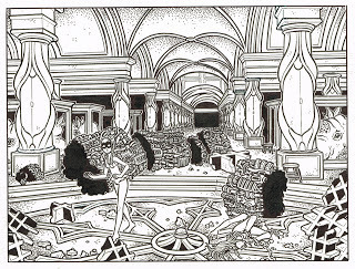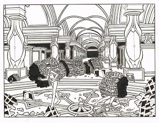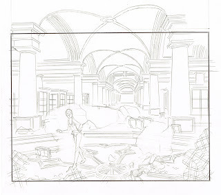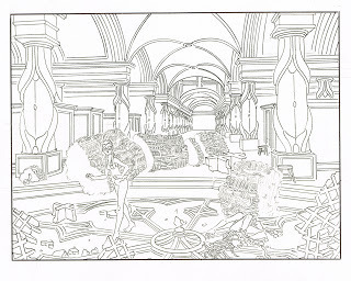 Here is the initial inking. Note that I modified the pillars to make them more suggestive.