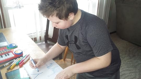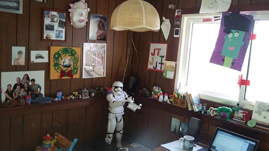 And while it's a great place to work, it faces south. This means that in winter, the sun is low on the horizon and there are no trees to block the glare. Since my window doesn't have blinds (and since blinds would block out all the sun entirely and I would be working in a dark cavern all day), I use a picture of Frankenstein Mr Bunches made. Periodically I have to stop what I'm doing, stand up, and move the picture a bit to the right in order to keep blocking the sun.