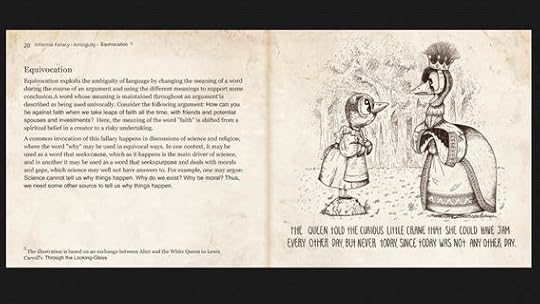 An Illustrated Book Of Bad Arguments let me do just that over the past day and a half. This book was a Valentine's gift from Sweetie; I took (most of) the day off from work on Friday to celebrate an early Valentine's, as spending time together is a lot easier when the boys are in school. We saw Deadpool and ate burgers for lunch and hung out a bit and then went out for dinner that night; we were going to go someplace fancy but by the time we got there, the wait was an hour, so we went to Perkins. I wholeheartedly support any restaurant that serves breakfast around the clock.)(The Perkins is pretty near our house and we go there most of the few times we go out to eat. Sweetie likes to go there, she says, "because it's never very busy." I like to point out that the very reason she likes it is why it might not be there forever.)