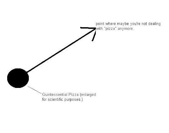 Maybe that's not your idea of a pizza. Maybe your idea of a pizza is something thinner crusted or square or with anchovies or whatever, but that's not the point. Or it is the point but I'm not yet at the point where I'm ready to make my point, so whatever your idea of a pizza is, of the quintessential pizza, get that picture in your mind, and picture your own Quintessential Pizza as the point at which the ray begins.