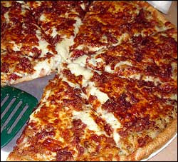 So when is a pizza no longer a pizza? Is a breakfast pizza a pizza? I had a sample of breakfast pizza at the store two weeks ago -- miraculously, given that pizza samples are amazingly rare in the real world, and I had to wonder is this pizza? It was round -- like a pizza, except that sometimes when I make pizza at home I run out of pans and have to resort to making some of them square or rectangle. It had a pizza crust on it, which is like a pizza. But it had eggs and cheese, and while pizzas have cheese they don't have breakfast-y kind of cheese on them, they have pizza-y kinds of cheese on them: mozzarella, which I think is chosen for the way it can hold everything on the pizza while not having much actual flavor, which is why I usually substitute in some other kind of cheese on my homemade pizzas: I like the stronger flavor.