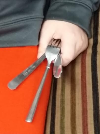 We have a little boy who wants to carry around a couple of forks with him. This little boy cannot talk. He had brain surgery when he fell of a counter and still has a scar from that, and because of that he cannot go on bounce castles, trampolines, or many other things little kids love. He cannot eat most foods. Because he is so worried about things he likes to feel enclosed and so even though he has a very nice bed with an extra-soft mattress on it and Spongebob Blankets, he sleeps in a closet I've removed the door from because he wants walls on three sides of him. He has to be watched when he goes to the bathroom and can't have the door closed because of that head injury. He is strapped into his bus seat with a safety harness, and held by the hand 99% of his life.