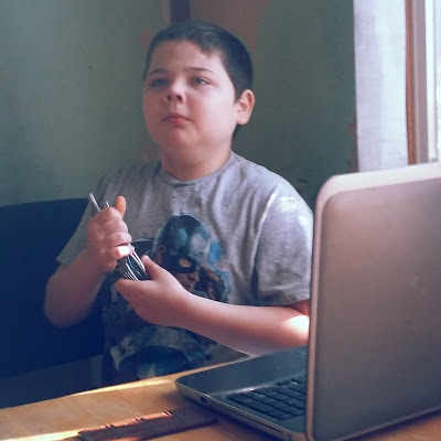 Even then, it's hard for him. That's why, we think, he sometimes loses it and starts crying and screaming. When he gets that bad, we cut down the interference even more: I take him for a ride in my car, which is a two-seater and small and he can feel the vibrations. He sits in his blanket and taps his forks and we listen to audiobooks and we drive the same route, almost every time, to help him calm down.
