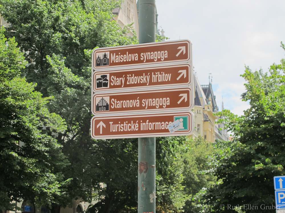 Signage in PragueLocal guidebooks, web sites, and other resources provide a wealth of information. Many Jewish heritage sites that were once tragically abandoned have become attractions, increasingly on mainstream travel itineraries that mix the "Dark" with the Destination: a glossy brochure I once read promised that a four-star Jewish Heritage Cruise down the Elbe River would "look both backwards and forwards, reviewing the rich Jewish culture of key cities, confronting the atrocities of the Second World War, and embracing a positive future."