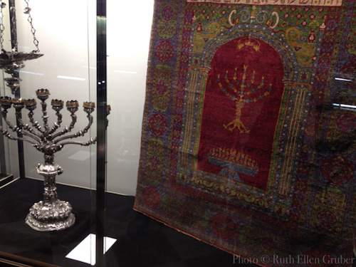 The exhibit includes items from the Jewish community’s extensive collection of Judaica objects from past centuries to the present. Among them are a very rare Mameluk parochet from Egypt dating back to the 15th or 16th century.