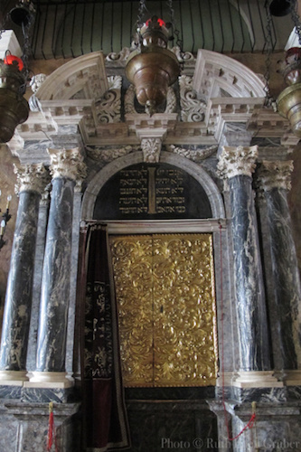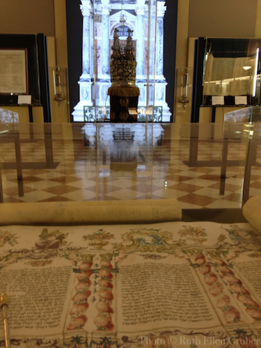 Bimah in the Italian rite synagogue. Photo © Ruth Ellen GruberThe sanctuary of the Italian synagogue is a small, rather long and narrow space, with an elaborately carved Ark and a delicate wooden Bimah positioned to face each other from the middle of the long sides of the room. The Bimah is believed to have been carved from the wood of a single tree that fell in the botanical gardens.