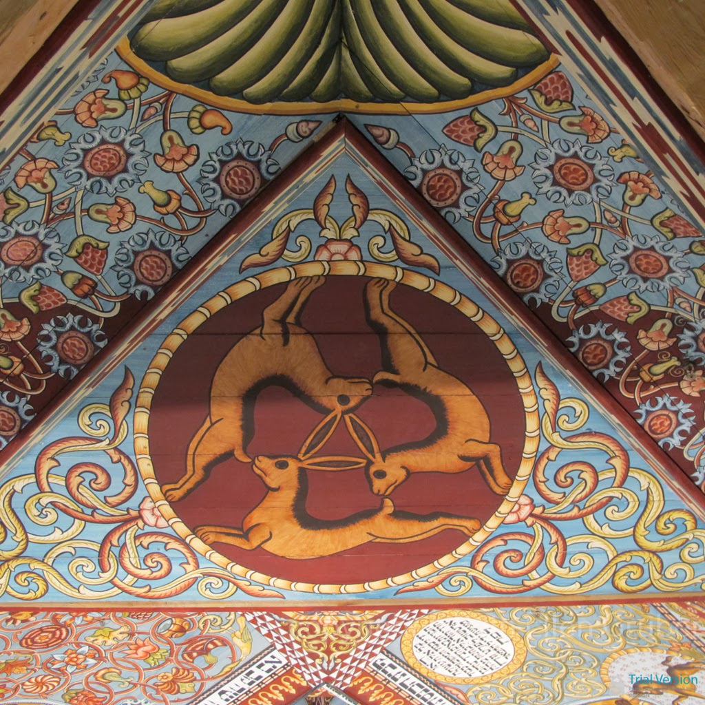 The "Three Hares" motif in the painted ceiling of the Gwozdziec synagogue repica. Photo © Ruth Ellen GruberBy Ruth Ellen Gruber