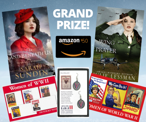 GRAND PRIZE: signed paperback copies of Julie Lessman’s A Wing and a Prayer and Sarah Sundin’s The Land Beneath Us (winner may also choose a CD audio version of my book or an early copy of my 2021 release), a $50 Amazon gift card, and memorabilia from the incredible National WWII Museum Store, including V-for-Victory earrings, Women of WWII sticky notes, and a Women of WWII zipper pouch!