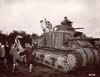 dressed as Santa Claus, arriving on a M3 medium tank,