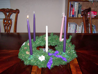 The Advent wreath became popular in Germany and Scandinavia, and worked its way to Britain and America. Traditionally it's a flat evergreen wreath with four candles - three purple and one pink, or four red candles - with a white candle in the middle. Even the least crafty person in the world (that would be me) can put one together.