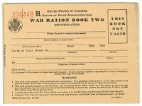 War Ration Books Two, Three, and Four contained blue stamps for processed foods, and red stamps for meat, cheese, and fats. Each person received 64 red stamps each month to provide 2 pounds of meat and 4 ounces of cheese per week. The stamps were printed with a number for point value and a letter to specify the rationing period—such as B8. Rationing calendars printed in newspapers notified people of which stamps were current and for how long. To prevent fraud, the stamps had to be torn off in the presence of the grocer. Stamps were good for eight, five, two, or one points each, with no “change” given, so the shopper had to be careful to use the exact number of stamps. The system was simplified on February 27, 1944, when plastic tokens were issued as change.