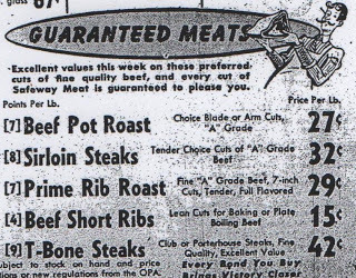 Each cut of meat had a point value assigned per pound, based not on price or quality, but on scarcity. These point values varied throughout the war depending on supply and demand. “Variety meats” such as kidney, liver, brain, and tongue had little use for the military, so their point values were low. On May 3, 1944, thanks to a good supply, all meats except steak and choice cuts of beef were removed from rationing—temporarily.