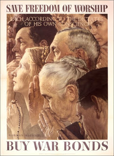 During World War II, President Roosevelt declared Four Freedoms he felt were fundamental to humanity: freedom of speech and worship, and freedom from fear and want. Rockwell's Four Freedoms paintings were made into posters for the US Second War Loan Drive in April 1943.