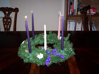 Light the first purple candle (the Prophets' Candle) and the second purple candle (the Bethlehem Candle) as shown. The purple symbolizes penance. Traditionally, the older children light these candles, but use your judgment.