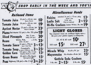 Starting March 1, 1943, three hundred items were rationed, including canned or bottled or frozen fruits and vegetables, canned or bottled juices and soups, and dried fruits. Fresh fruits and vegetables were not rationed, nor were pickles, relishes, or Jell-O.