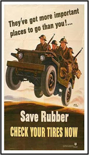 Since civilians had to make five tires last the entire war, they had to be extremely careful. People were encouraged to drive less - in fact, the primary purpose of gasoline rationing was to protect tires. A "Victory Speed" of 35 mph was instituted - tires wore out half as quickly at 35 mph than at 60 mph. Slow and steady stops, starts, and turns also reduced wear on the treads. Everyone was encouraged to use public transportation, to share rides, and to avoid rough roads. Proper auto maintenance was more important than ever - brake adjustment, wheel alignment, tire inflation, tire rotation, and early repair of holes all prolonged wear. In addition, all auto racing was banned.