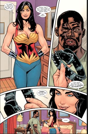 The problem, then, is in making Trevor African American. The only goal is to make him something other than white. The choice to make him black is loaded with problems, if only due to the imagery involved. On Themyscira, submission to another is considered a form of trust, of love, but to ask the sole black character in this book to wear bondage gear seems tone deaf. I wouldn’t go so far as to call it offensive, but the idea is never really addressed or fleshed out, so we simply have Diana trying to convince Steve to wear clothing meant to evoke images of slavery. On one hand it speaks to Diana’s ignorance of this new world and Steve’s place in it, but that’s as far as it goes. And given that Steve could be any ethnicity other than white for his new role to work, it’s hard to understand why Morrison decided he should be black.