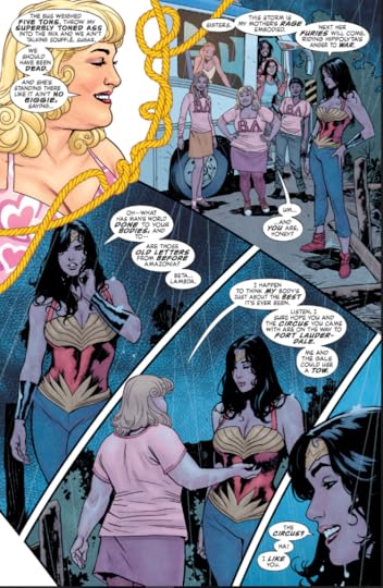 Etta is, compared to every other female in this book, overweight. And while her introduction to the story is when she gives her testimony at the trial of Wonder Woman, chronologically her first appearance comes on a bus ride with her sorority sisters to South Beach for spring break. It comes with one of her sisters suggesting that she ate the food they had gathered to feed the less fortunate. In other words, it feels like she’s being body shamed.
