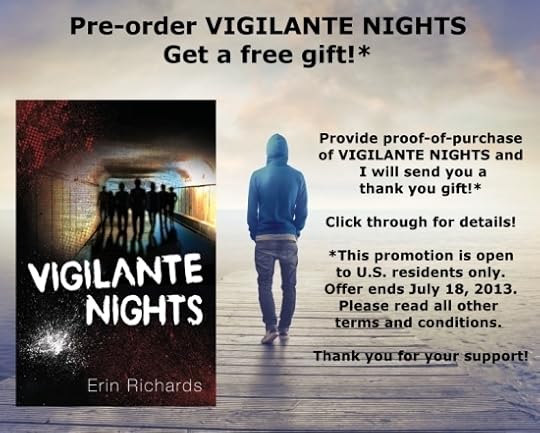 I also have other giveaway opportunities coming up as I approach and celebrate my release date on July 18, 2013. Keep an eye on my blog and social media for these opportunities! Here are a couple that will include signed final copies of Vigilante Nights, eBook copies, gift cards and swag! Plus, make sure you come back here on July 18 for my release day special! It's going to be good!