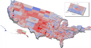 What I found interesting about the map was what a complete mess it was. Let's say the blue and the red teams agreed to divide the country up and go their separate ways; they'd have one hell of a hard time accomplishing the job. It wouldn't be a question of fair's fair—it would be chaos. I suppose they could agree that Wyoming, Nebraska, and Kansas are red, while Hawaii, Delaware, and Vermont are blue, but after that you'd be carving up states willy-nilly.