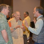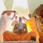 On Friday, Radhanath Swami participated in the installation of Srila Prabhupada’s murti with other god brothers and sisters and attended the first arati as Virabadra Ram Das, visiting Executive Director of New York’s Bhakti Center, led a rousing Guru Puja kirtan. Later, Radhanath Swami presided over the netronmelan (eye opening) ceremony of Sri Radha Gopijan Vallab. Auspicious items were shown to Radha and Krishna as the gathered community had their first chance to see Their beautiful forms.