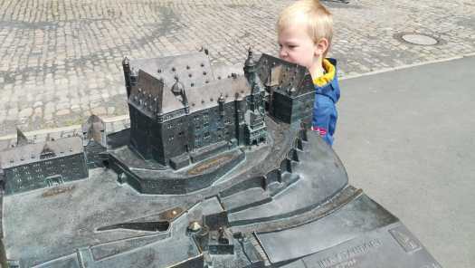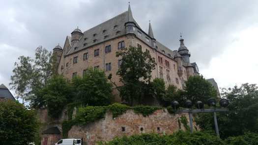 Foto 9: Achteraf gezien was het stom van mij dat ik mij die noten liet ontfutselen, want op de camping stonden waarschuwingsborden dat je goed op je spullen moest passen vanwege op roof uit zijnde wasberen.Vanaf Marburg volgde ik de fietsroute langs de Lahn zodat mij veel klimwerk en autoverkeer bespaard bleef. Helaas waren de wegaandhidingen niet overal even duidelijk. Bij Weilburg was het weer een puzzelrit. Ik gokte verkeerd wat deze keer als voordeel had dat ik in het oude centrum terecht kwam. Dat had ik met een goede bewegwijzering zomaar gemist. Zo zie je dat slechte aanwijzingen je op goede plaatsen kunnen brengen.