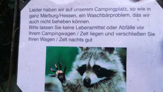 Foto 8: Op de camping van Marburg stal een wasbeer een zak noten onder mijn ogen vandaan. Ik zat aan een picknicktafel te praten met een Duitse en een Oostenrijkse fietser toen het beest heel brutaal met die zak mijn tent uit kwam lopen. De noten redden kon ik niet meer maar nog snel mijn camera richten en afdrukken wel. Daar hield ik dan toch deze aardige foto aan over. De vraag is: ‘Wat is beter: zo’ ’n mooie foto of een zak noten?’