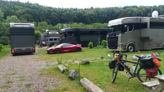 Foto 19: Nog een plaatje van een stel van die kampeerkastelen op wielen met er bij de lelijkste auto ter wereld en de mooiste fiets van het universum. En voor zo’n raar misvormd autootje betaal je, schat ik, al gauw 10.000 euro, als het niet meer is. Ik wilde de Lahn volgen tot zijn monding in de Rijn (Rhein schrijven ze in Duitsland maar onze oosterburen hebben de spelling nooit geheel onder controle gekregen) maar vond op de kaart een route langs de Aar waarbij ik een flink stuk afsneed. Het gif zat hem hier helaas in de staart want om bij de Rijn te komen moest ik nog een forse heuvel over. Daarna reed ik langs de Rijn verder zuidwaarts, maar als ik nu dacht dat alles op rolletjes zou lopen had ik het mis, want bij Ludwichshafen werd de route weer een echte padvinderij, eigenlijk veel meer een padzoekerij. Ik moest om het enorme chemiebedrijf van BASF heen voordat ik het fietspad langs de Rijn terug vond. (Dat bedrijf deed me overigens denken aan de metershoge stapel muziekbandjes die ik in de loop van enkele jaren kocht om er concerten van de radio met behulp van een recordertje op te zetten. En toen ik die verzameling symfonieën, vioolconcert, pianoconcerten en strijkkwartetten trots in de kast had staan kwam de CD opzetten en kon ik het hele bandenspulletje triest naar de kringloopwinkel brengen. Nu, met de wonderen van het internet, hangt datzelfde Zwaard van Damocles boven het hoofd van mijn uit de hand gelopen CD verzameling, maar ik denk er niet over om die ook op te doeken. Zo erg wil ik niet meewerken aan onze dolgedraaide consumptie cultuur.)