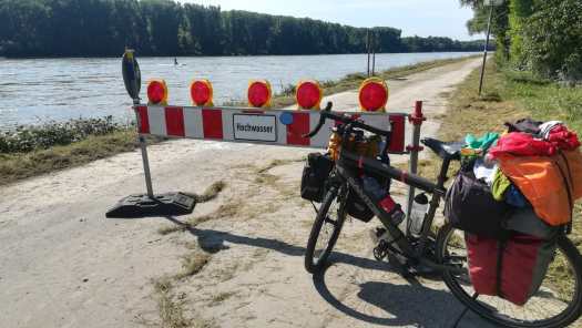 Foto 24 : Voorbij Speyer kreeg ik met hoog water in de Rijn ten gevolge van extreem veel regenval te maken, maar het was gelukkig alweer zover gezakt dat ik over het fietspad langs het water verder kon.Een veerpontje bracht mij aan de westelijke oever van de Rhin in Rhinau, waardoor ik mij in plotseling in een ander land bevond: Frankrijk.