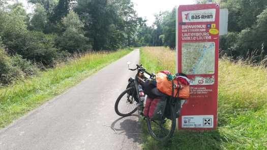 Foto 25: Ook de Fransen slaan de plank mis met de spelling van de Rijn. Het schijnt voor buitenlanders een lastige rivier te zijn.Let op het colablikje onder de binder achterop de fiets. Daaraan heb ik me een financiële buil gevallen. In Duitsland zit er, net als bij ons, statiegeld op blikken. Pfand heet dat daar, maar wat erger is: het bedraagt maar liefst 20 cent ipv bij ons 15 cent. En ik was de grens (Rijn) al over toen ik de inhoud naar binnen goot. Ik kon dat blikje dus niet meer inleveren tenzij ik er speciaal weer voor zou overvaren. Weg 20 cent! Je maakt wat mee op zo’n reis.