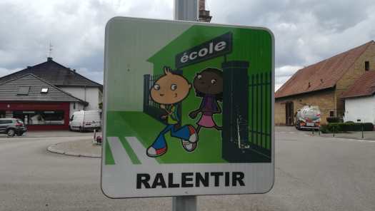 Foto 2: Frans waarschuwingsbord : snelheid verminderen in verband met een school.Maar zo kan het in deze tijd natuurlijk niet meer! Sjors en Sjimmie is ook taboe. Met zo’n bord riskeren de Fransen een nieuwe revolutie.