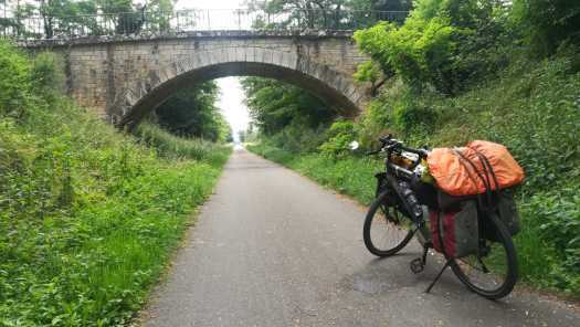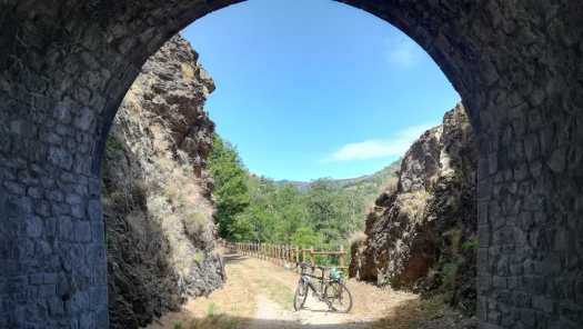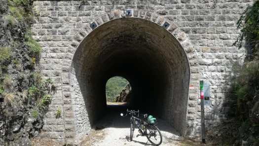 Foto 9: Bij Florac maakte ik een ritje zonder bagage over een tot fietspad omgebouwd oud spoorwegtracee. De route ging door een smalle groene vallei naar St. Julien d’Arpaon. Zonder die baal bagage voelt zo’n fiets toch wel een stuk sympathieker aan dan met het hele spulletje er op en dan heb je ook minder repen chocolade nodig.