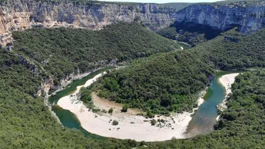 Foto 3: Een volgende meander van de Ardeche. En als je hier over tweehonderdmiljoen jaar terug komt, zal die istmus verdwenen zijn en vloeit de Ardeche daar gewoon rechtdoor in plaats van die grote lus te maken, althans dat voorspel ik. Ga maar kijken!