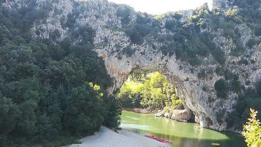 Foto 5: De Pont d’Arc, de Boogbrug, dicht voor Vallon Pont d’Arc. Die is ook door de slijtende werking van het water van de Ardeche ontstaan, maar ik ga er niet aan rekenen want dan gaan de niet-rekenaars afhaken en dat moet natuurlijk niet. Bovendien pretendeer ik bij foto 5 geen correcte berekening gemaakt te hebben. Het is slechts een gedachtenspel dat berust op niet geverifieerde aannames, maar het geeft een idee van de kracht van de tijd.Het was een mooie rit langs deze Gorges, zoals mijn foto’s ongetwijfeld bewijzen maar het plezier werd gedeeltelijk vergald door honderd miljard knetterende en met ontzagwekkende vaart langsscheurende motorfietsen. Misschien overdrijf ik iets in aantal, maar niet veel. Het leek wel of alle motorfietsen uit geheel Europa juist vandaag hier langs denderden. Merkwaardig dat de Franse overheid dit soort geweld, met bijkomend gevaar op de weg, tolereert. Ook merkwaardig dat al die lawaaiproducenten, uitgezonderd de nette motorrijders die er ook wel zijn, zich totaal niet generen terwijl ze zoveel medeburgers ontzettend irriteren met dit acoustische en gewelddadige machogedrag. Je zou je toch te barsten schamen als zo’n teringherrie produceerde!