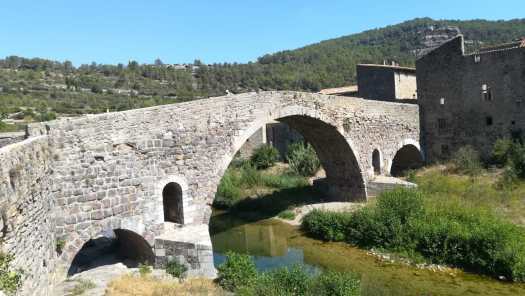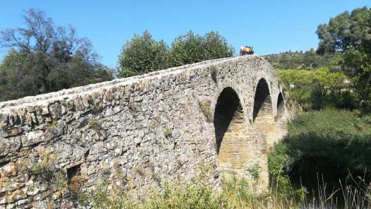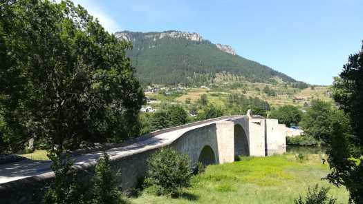Foto 14: Oude brug over de Tarn bij Quezac.De dag na Quatorze Juillet, fietste ik, nu gelukkig weinig gehinderd door motorduivels, door de Gorges du Tarn, waar ik vorig jaar ook door reed. In de jaren zeventig van de vorige eeuw was ik daar voor het eerst en als de zon schijnt is het, hoe vaak je er ook komt, de moeite waard. Hier volgen, tot besluit van deze aflevering, nog een drietal plaatjes van deze prachtige kloof. Mogelijk heb ik (bijna) dezelfde foto’s vorig jaar al geplaatst op deze blog. Voor de lezer een leuke opgave om beide series te vergelijken. Dat honderdste deel van een millimeter dat de canyon minder diep was dan nu zal niet te zien zijn, maar misschien zijn er andere verschillen. Een interessante variant van de ‘Zoek de zeven verschillen-puzzel’ om een middag van verveling door te komen.