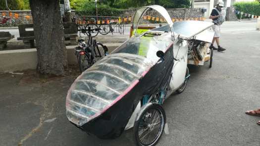 Foto 11: Er waren de meest merkwaardige fietscreaties te bewonderen. Op het plaatje zien we een gestroomlijnde ligfiets die rijdt op zonne-energie.