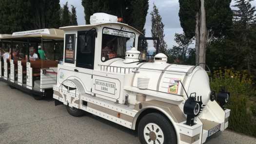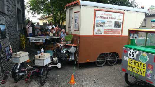 Foto 12: En hier een Willy Wortel-achtige uitvinding, ook op zonne-energie, die een woonwagen moet trekken. Te oordelen naar de snelheid waarmee hij een demonstratie-ritje door de straten van Le Caylar maakte, was hij door de zon, hoewel het mooi weer bij 35 graden Celcius was, letterlijk en figuurlijk niet vooruit te branden. Maar misschien laait hij in de Sahara, als het zonnetje zijn best doet, van de trekkracht.