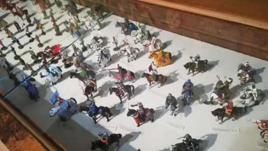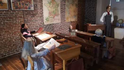 Foto 21: Tinnen soldaatjes onder een vitrine. Zulke soldaatjes had ik ook. Ik begin waarachtig te schrikken van die herinneringen. Ben ik al zo oud?? Nee, toch! Ik fiets nog flitsend door Frankrijk. Maar de tijd gaat wel snel. Straks zetten ze ook mij nog in een museum! Dit museum was voor mij een sprong in de tijd.En nu we het toch over een sprong in de tijd hebben: Ook dit bericht nummer 5 is een sprong in de tijd, of eigenlijk een sprongetje, want het was 1 Augustus toen ik dat museumpje bezocht. Voor de duidelijkheid: 1 Augustus 2024, dus dit jaar. Toch nog wel een sprongetje van bijna twee maanden! Zoals gewoonlijk sukkel ik met mijn berichtgeving een flink stuk achter de werkelijkheid aan en dat komt ook omdat die tijd zo snel gaat. Ik ben ondertussen weer thuis (in Nederland in 2024, voor de duidelijkheid), maar voor u, lezer, loop ik dus nog in dat klaslokaaltje, maar dan wel in 2024 en als bezoeker en niet in 1956 als scholier.
