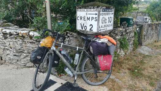 Foto 15: Saint Valier sur RhoneBij Pont Saint Esprit stak ik de Rhone over en verliet ik de Via Rhona, de fietsroute van Lyon naar de Middellandse Zee. Ik reed omhoog naar Saint Paulet de Caisson, waar ik in de tuin van een enthousiaste motorfietssleutelaar mijn tent mocht opzetten voor de nacht. Hij maakte voor mij, zijn broer (ook een motorfietsenthousiast) en hemzelf een barbecue. Toen het donker werd had hij een mooi lichtgewicht lampje dat veel licht gaf en toen ik later mijn donkere tent opzocht, gaf hij mij de lamp cadeau. Ik zei dat ik dat niet kon aannemen, maar hij antwoordde dat hij er nog een had en liet me die zien: ‘Toe, neem mee dan kun je tenminste je spullen in die tent terugvinden.’ Een reuze aardige motorrijder die mij verzekerde dat het hem bij het rijden op zijn favoriete machine slechts ging om het rijplezier en niet om het lawaai en snelheidsrecords te breken. ‘ En natuurlijk om de motor uit elkaar te halen en hem dan weer in elkaar te zetten’, voegde hij er aan toe. ‘Dat is de helft van de fun.’