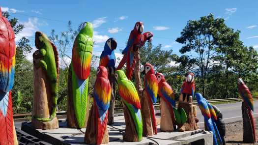 Foto 5: Papegaaien langs de weg, maar deze zijn van hout dus die kunnen goed tegen de vorst. Het blijft spannend in welk werelddeel we zitten.