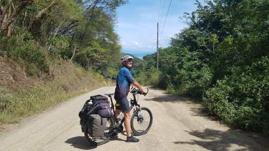 Foto 9: Uwe, mijn Duitse tijdelijke metgezel, op een gravelweg met op de achtergrond de zee.