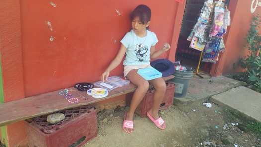Foto 10: Een meisje dat kettinkjes van kralen maakt, ergens bij een winkeltje, waar ijskoude cola te koop was.