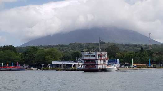Foto 8: De ferryaanlegplaats van Moyogalpa op het eiland Ometepe. Op De achtergrond de vulkaan Concepcion met een grijze pet op. Meer dan dit heb ik nooit van die vulkaan gezien.