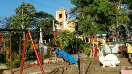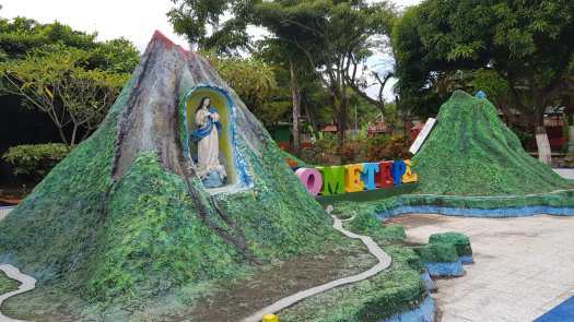 Foto 9: Het pleintje van Moyogalpa met de kerk half verscholen achter het groen.De volgende dag fietste ik rond de vulkaan Concepcion naar het plaatsje Altagracia dat, gezien vanaf Moyogalpa, pal achter de vulkaan ligt.
